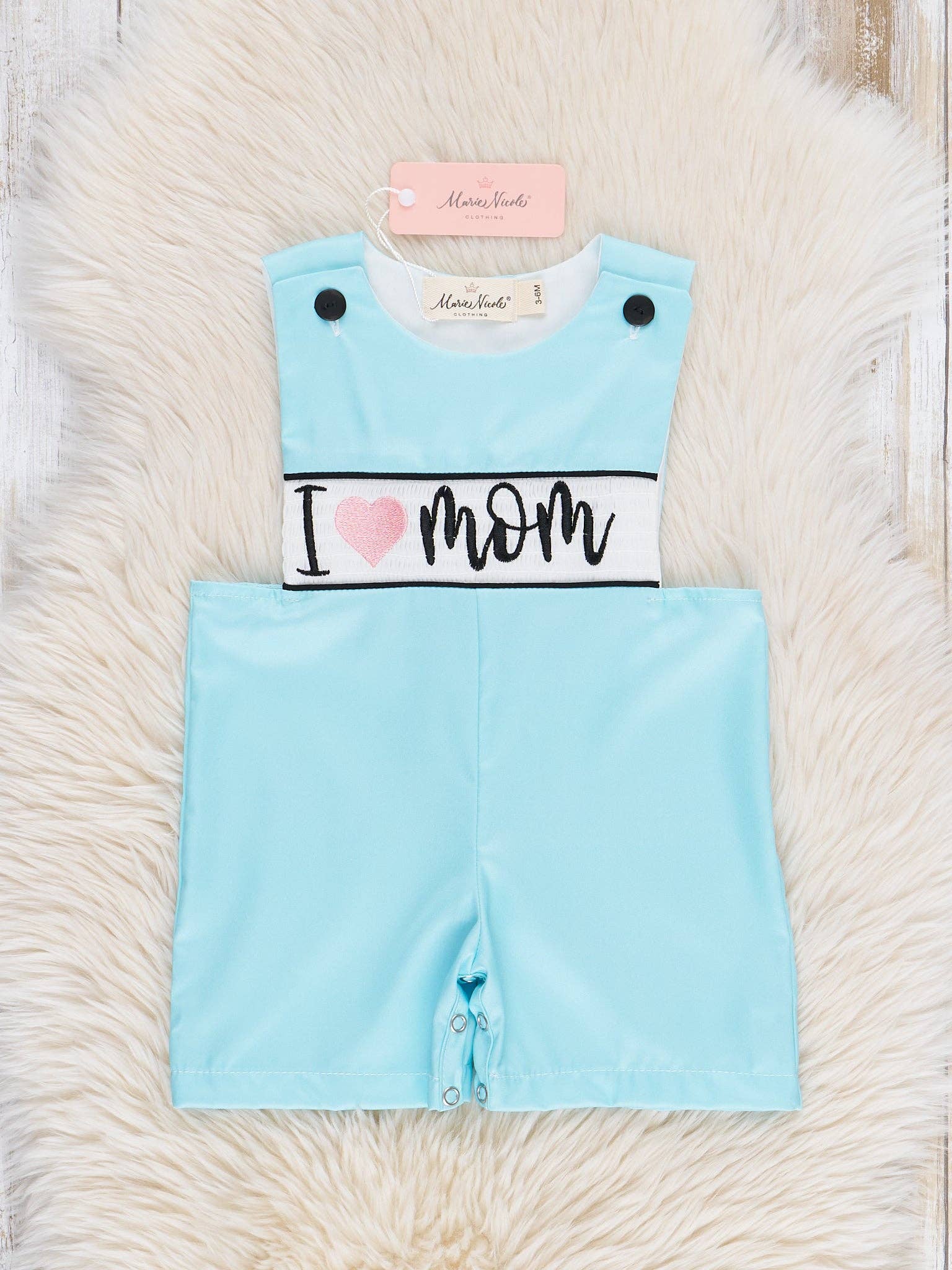 A romper by Marie Nicole Clothing for Mother's Day! This Aqua "I Love Mom" Smocked Johnny features smocking, an "I Love Mom" cursive detail, & functioning buttons on the straps. A piece full of love!