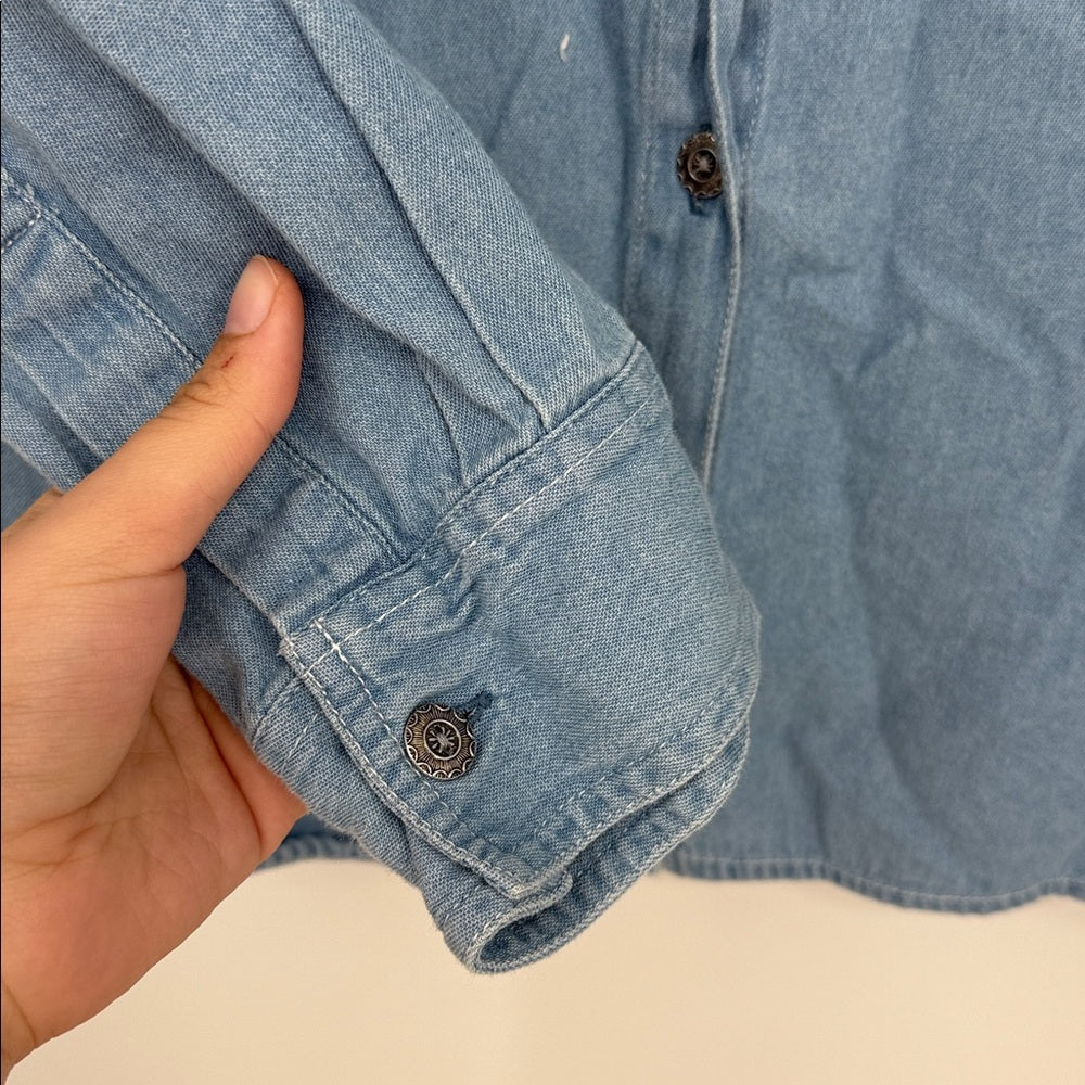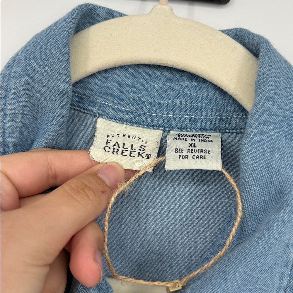 Celebrate spooky season with this vintage Fall Creek Halloween-themed button-up denim shirt! Featuring charming embroidered details of ghosts, a witch, a black cat, pumpkins, and stars, this shirt is perfect for Halloween parties, pumpkin patch outings, or adding a festive touch to your fall wardrobe.